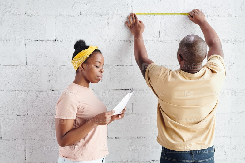 Африканская женщина смотрит на бумагу с фотографией интерьера гостиной, стоя рядом со своим мужем
