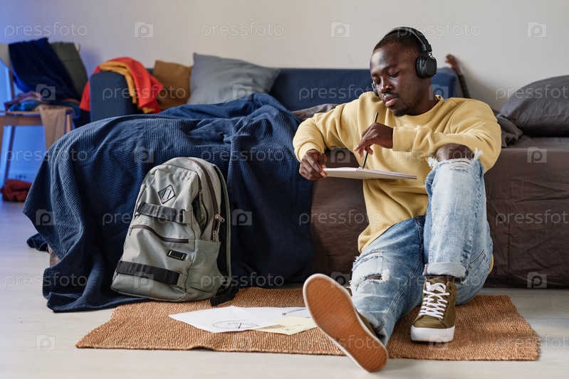 Серьезный расслабленный молодой чернокожий мужчина в наушниках сидит на полу и опирается на диван, рисуя эскиз в студенческой комнате