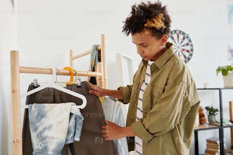 Мальчик-подросток выбирает одежду