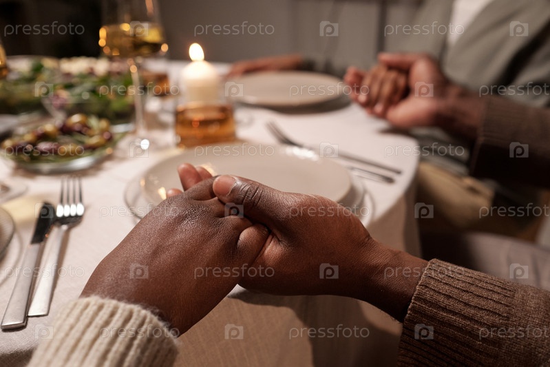 Руки молодой африканской пары во время молитвы у праздничного стола