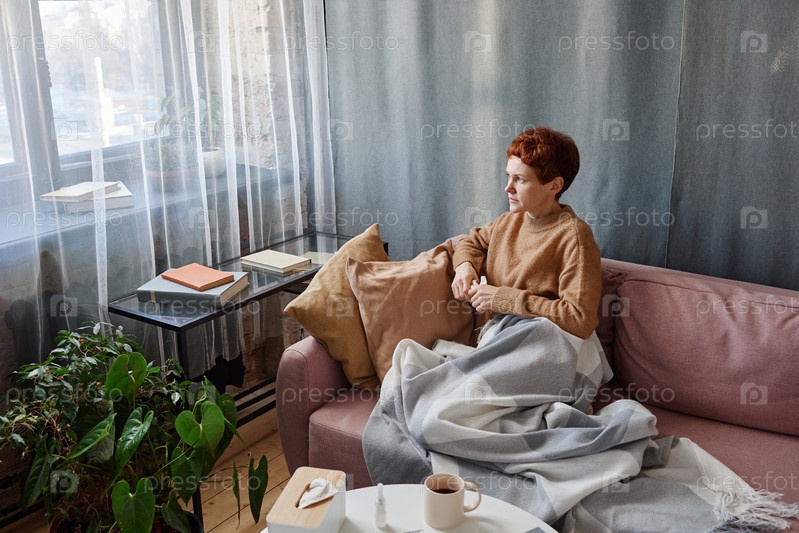 Горизонтальный высокоугольный снимок зрелой женщины с короткими волосами, у которой коронавирус сидит на диване дома и смотрит в сторону