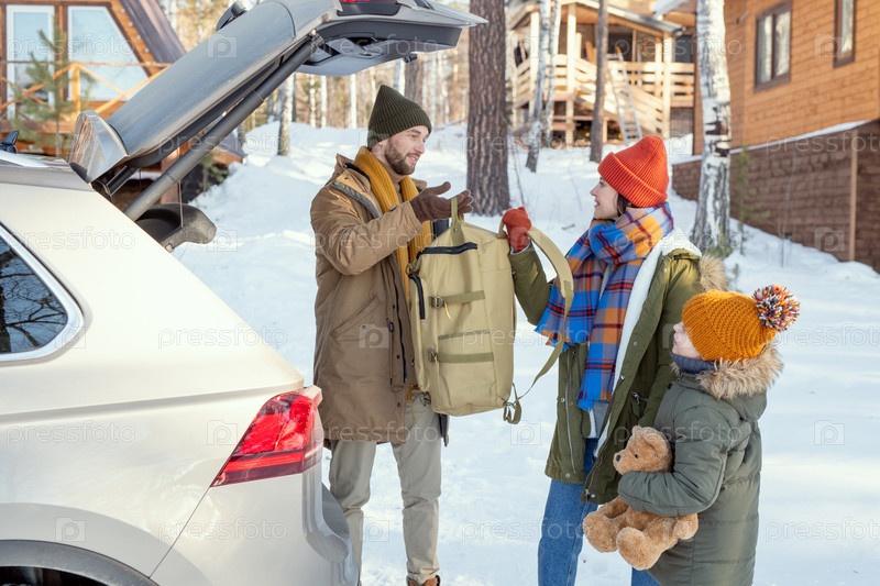 Молодая активная семья в теплой зимней одежде выносит свой багаж из багажника машины