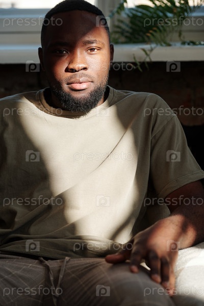 Молодой спокойный бородатый мужчина африканской этнической принадлежности смотрит на вас, сидя в кресле