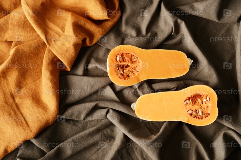 Высокоугольный вид двух частей тыквы с семенами и оранжевой плотью на морщинистой ткани
