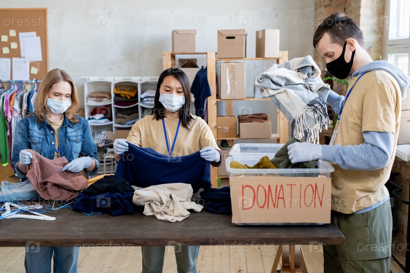 Люди в масках и перчатках выбирают одежду для пожертвований
