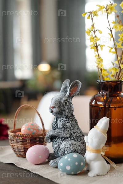 Два игрушечных кролика, корзина с окрашенными пасхальными яйцами и ваза с желтыми цветами
