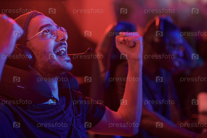 Эмоциональный игрок в киберспорте, делающий жест 'да'