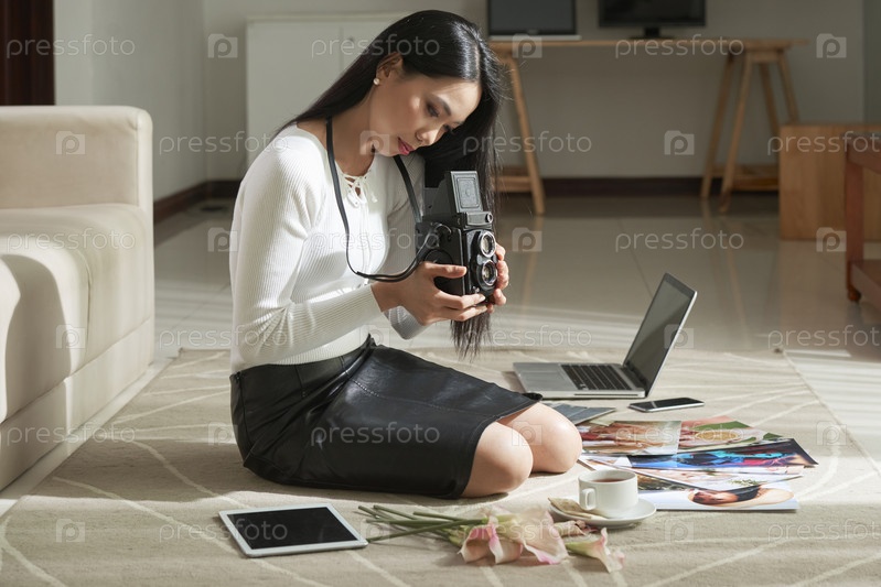 Молодой фотограф выбирает изображения на камеру