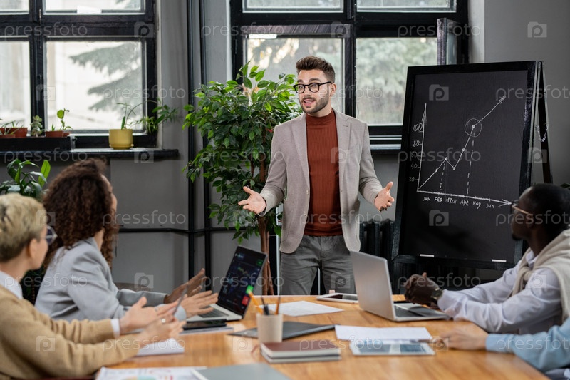 Уверенный бизнес-коуч объясняет график молодым межкультурным менеджерам