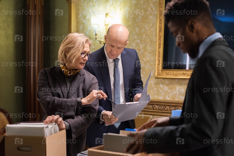 Уверенная в себе опытная юристка объясняет своему коллеге-мужчине условия контракта