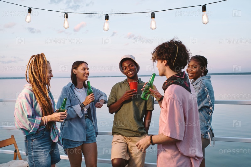 Счастливые многорасовые друзья с напитками, наслаждающиеся вечеринкой на свежем воздухе