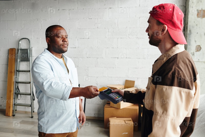 Молодая погрузчица в рабочей одежде держит терминал, пока африканский клиент-мужчина платит за погрузку багажа