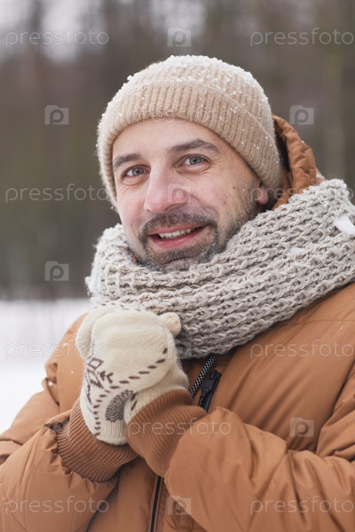 Улыбающийся зрелый мужчина наслаждается зимой на свежем воздухе
