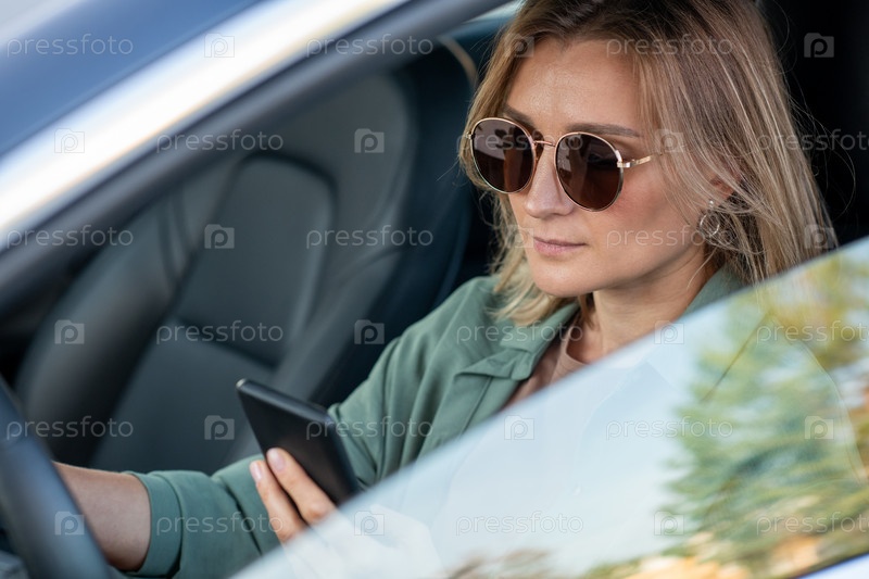 Молодая современная женщина водит машину и отправляет сообщения