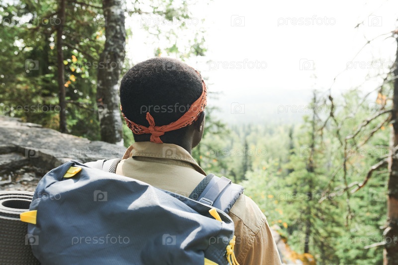 Задний вид черного рюкзальщика с платками, стоящего на горе и смотрящего на лес