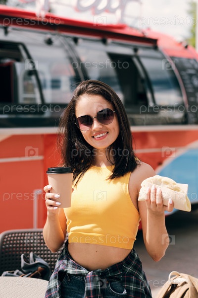 Счастливая молодая женщина в солнцезащитных очках, держащая бургер и напиток
