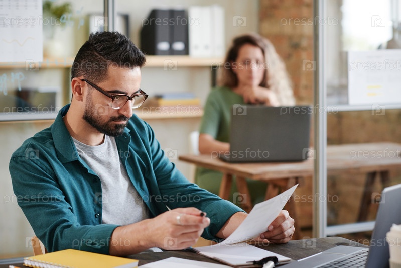 Бизнесмен рассматривает контракт за столом
