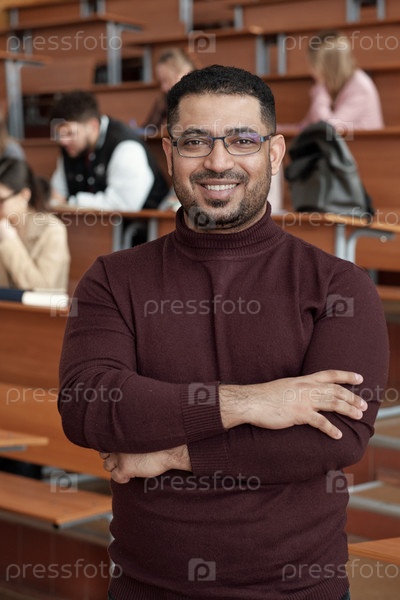 Веселый учитель-мужчина скрещивает руки за грудь, стоя перед камерой против учеников