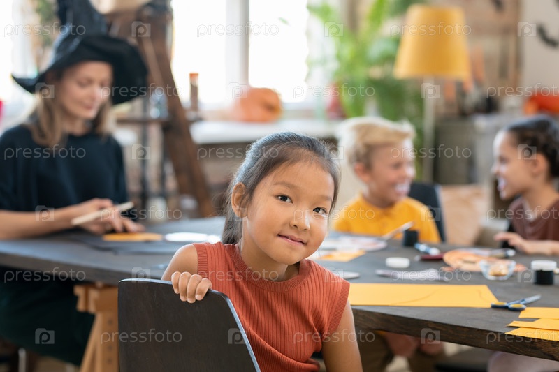 Красивая азиатская школьница смотрит на тебя, сидя за столом