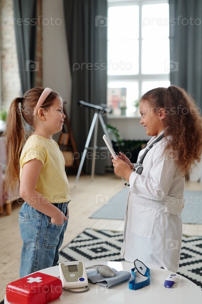 Маленькая девочка в белом халате консультирует своего пациента