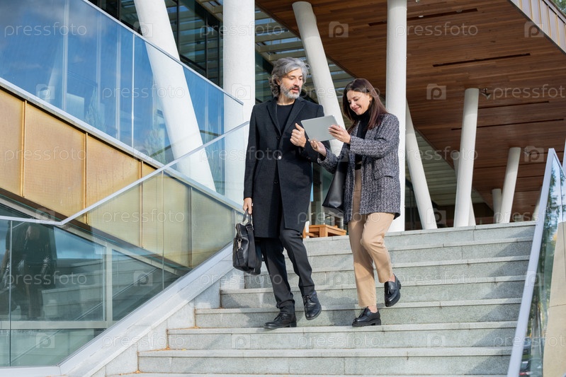 Деловая женщина с планшетом показывает онлайн-данные элегантному зрелому коллеге мужского пола