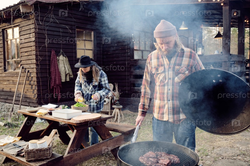 Семья готовит ужин на свежем воздухе