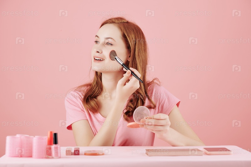 Улыбающаяся женщина наносит розовый блеск