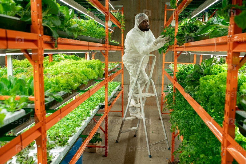Черный работник проверяет здоровье растений