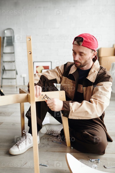 Молодой специалист по сборке мебели в области рабочей одежды, сидящий на полу и фиксирующий детали стула