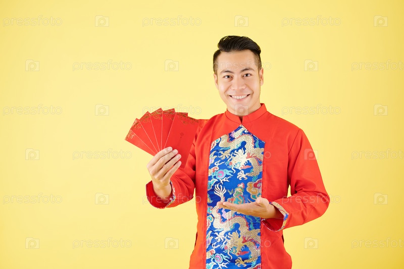 Мужчина, показывающий конверты с счастливыми деньгами