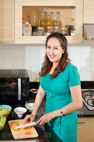 Вьетнамская женщина режет помидоры