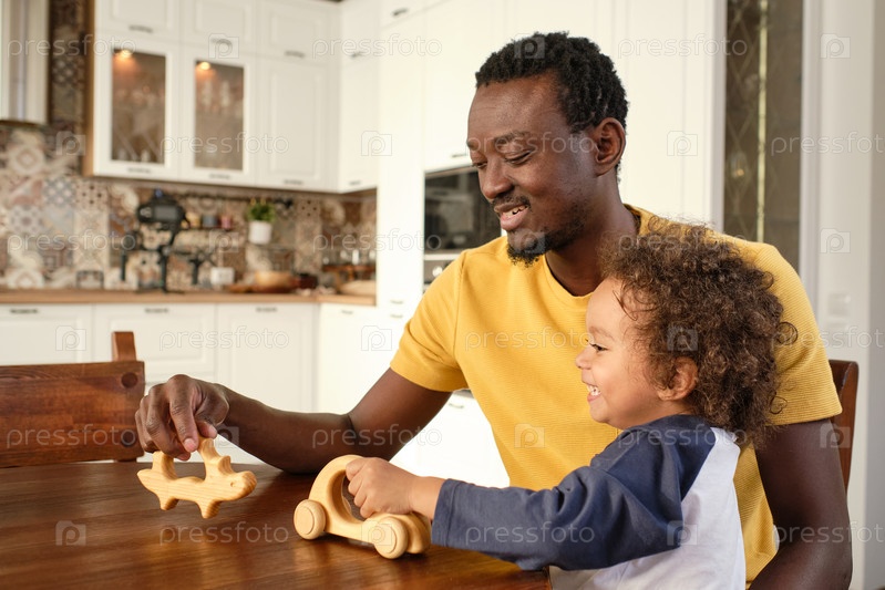 Счастливый отец и милый маленький сын играют в деревянные игрушечные машины