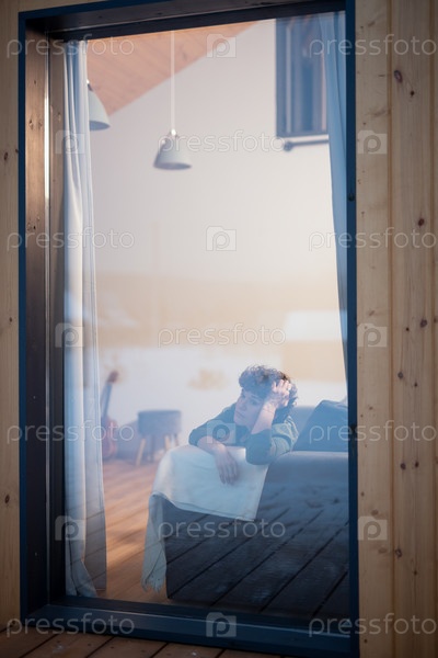 Молодая спокойная брюнетка отдыхает на диване перед большим окном