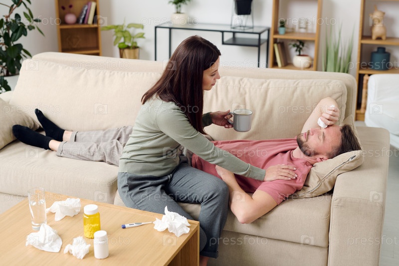 Молодая женщина осторожно ухаживает за больным мужем, давая ему горячий напиток