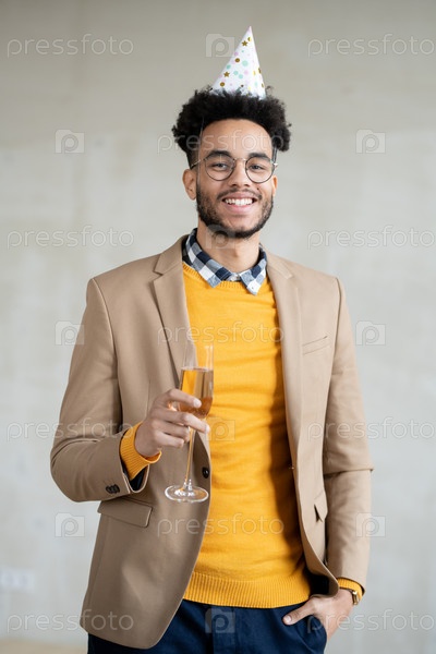 Счастливый молодой бизнесмен смешанной расы в умных повседневных одеждах и шапке на день рождения
