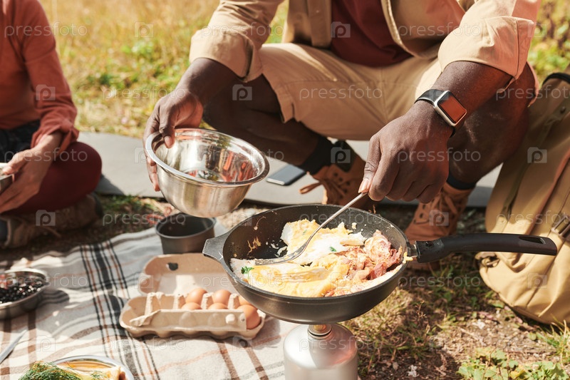 Близкий план неузнаваемого чернокожего мужчины в умных часах, который готовит яйца на горелке и кладет их в металлическую миску снаружи
