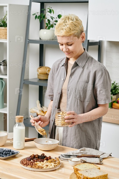 Здоровая молодая женщина готовит мюсли на завтрак