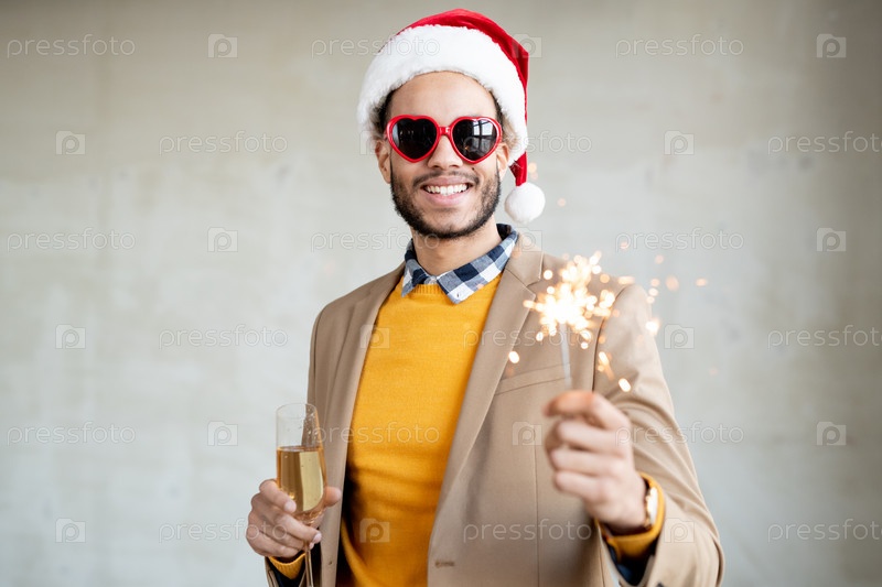 Улыбающийся бизнесмен, держащий флейту с шампанским и искрящимся бенгальским светом