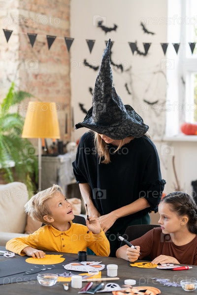 Милый мальчик с кистью смотрит на учителя в колдовской шляпе