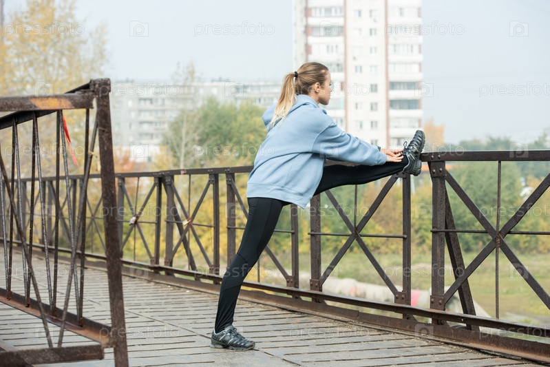 Молодая активная спортсменка в леггинсах и капюшоне, тренирующаяся на мосту на свежем воздухе