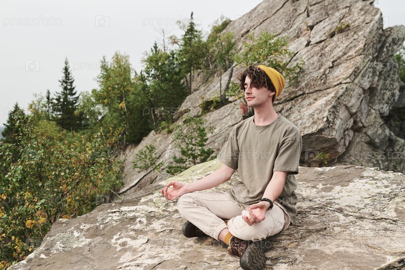 Удовлетворенный расслабленным молодым человеком в шляпе, сидящим в положении лотоса и медитирующим на большом камне на открытом воздухе