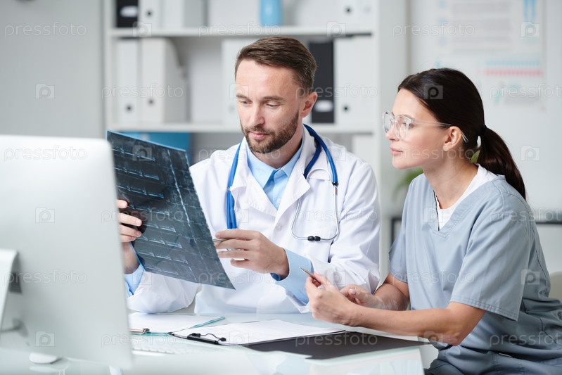 Два молодых клинициста в форме сидят за столом и обсуждают рентген пациента