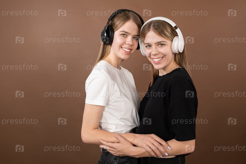 Две молодые девочки-близнецы в наушниках и футболках