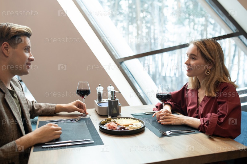 Блондинка в элегантном платье смотрит на своего парня, слушая его