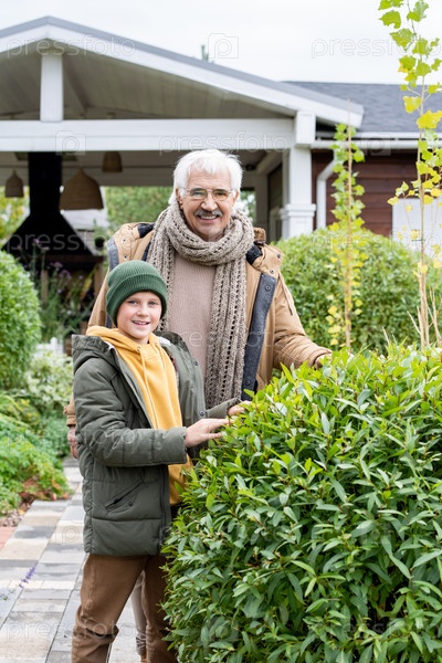 Счастливый внук и дедушка в теплых повседневных одеждах, стоящие у зеленого куста
