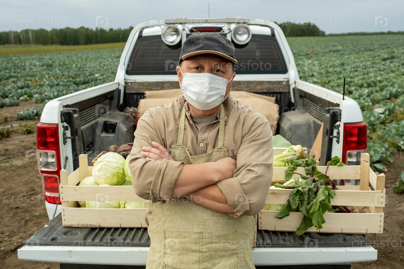 Современный фермер в защитной маске, стоящий против багажника машины