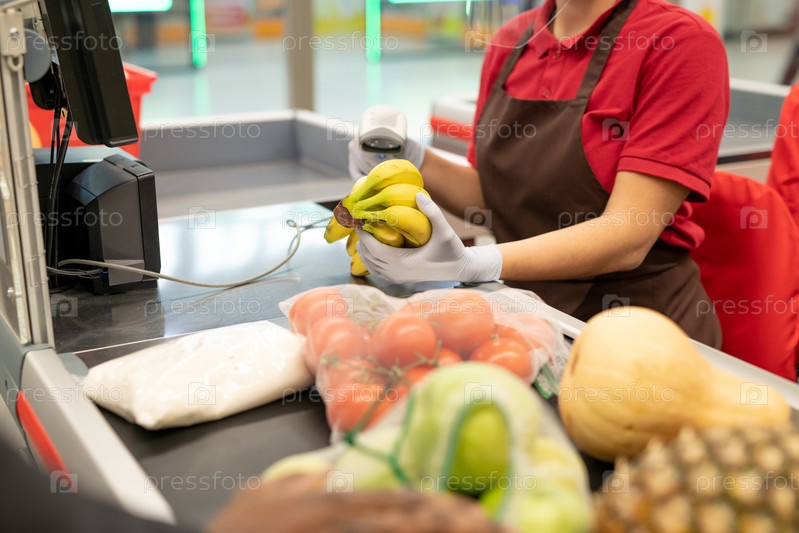 Молодая кассирша в форме и перчатках, держащая кусок бананов