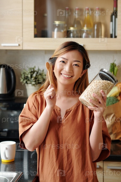 Женщина с банкой овсяной муки