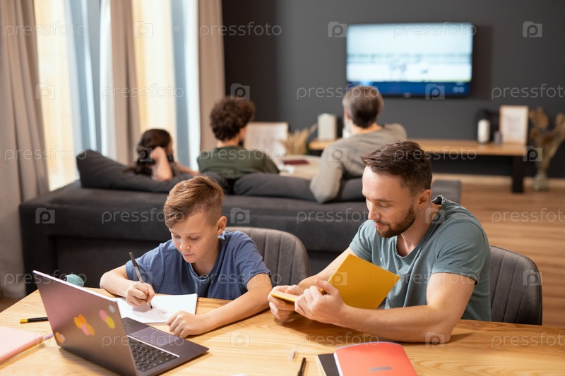 Молодой человек с открытой книгой читает текст, сидя рядом со своим милым маленьким сыном