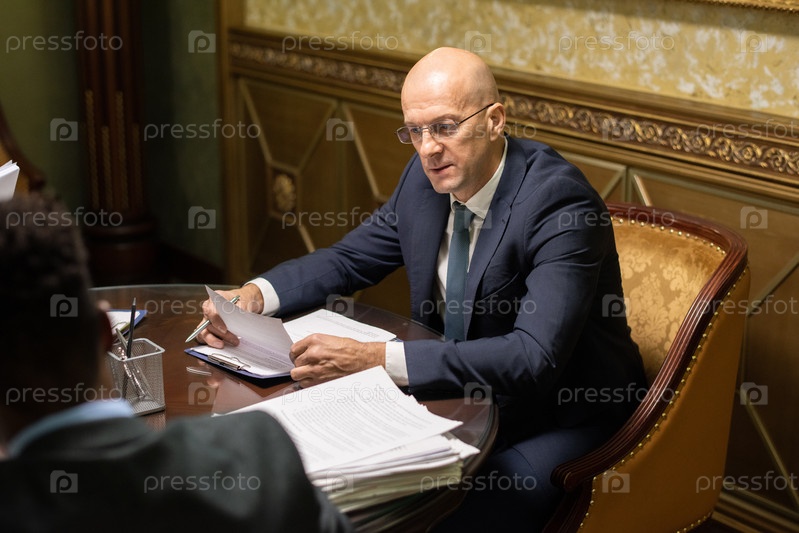 лысый бизнесмен в формальной одежде, общаясь с африканским коллегой